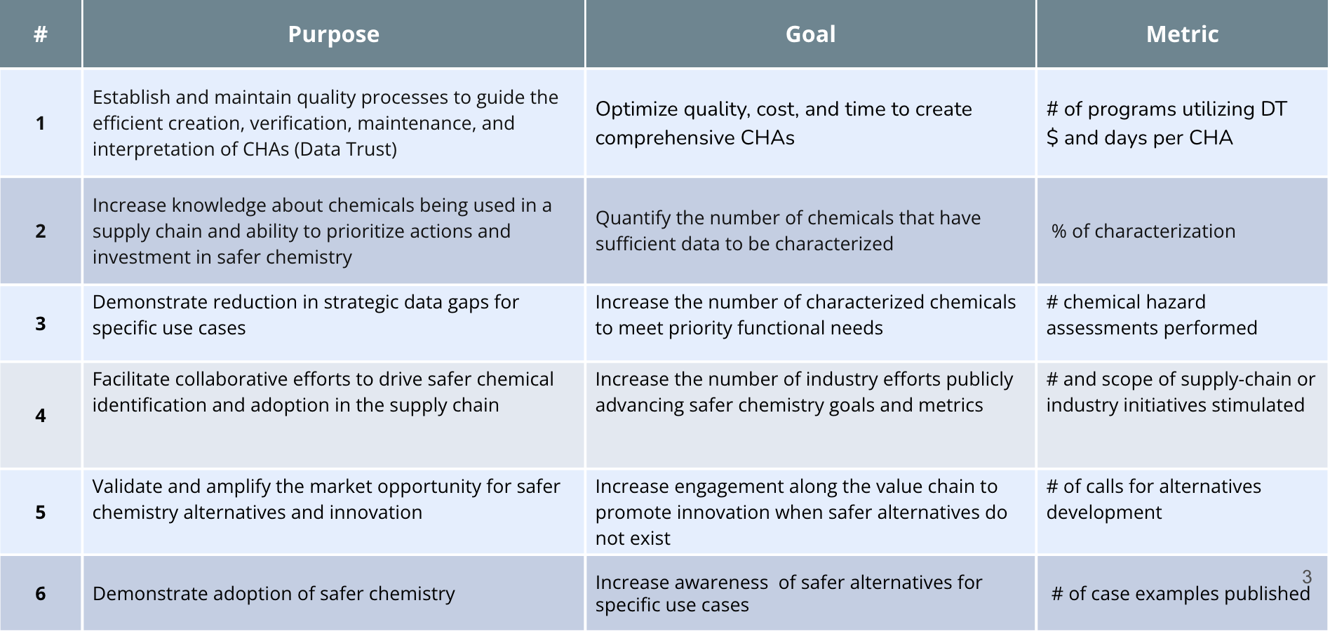 A full discussion of these metrics and the process by which they were established is available in our first publication Accelerating the Transition to Safer Chemistry: Establishing a Collective Vision & Impact Metrics. We invite you to join us and contribute to accelerating science-based, data-driven efforts that meet the moment and set a course for using chemicals and chemistry in harmony with planetary boundaries and healthy life on earth.